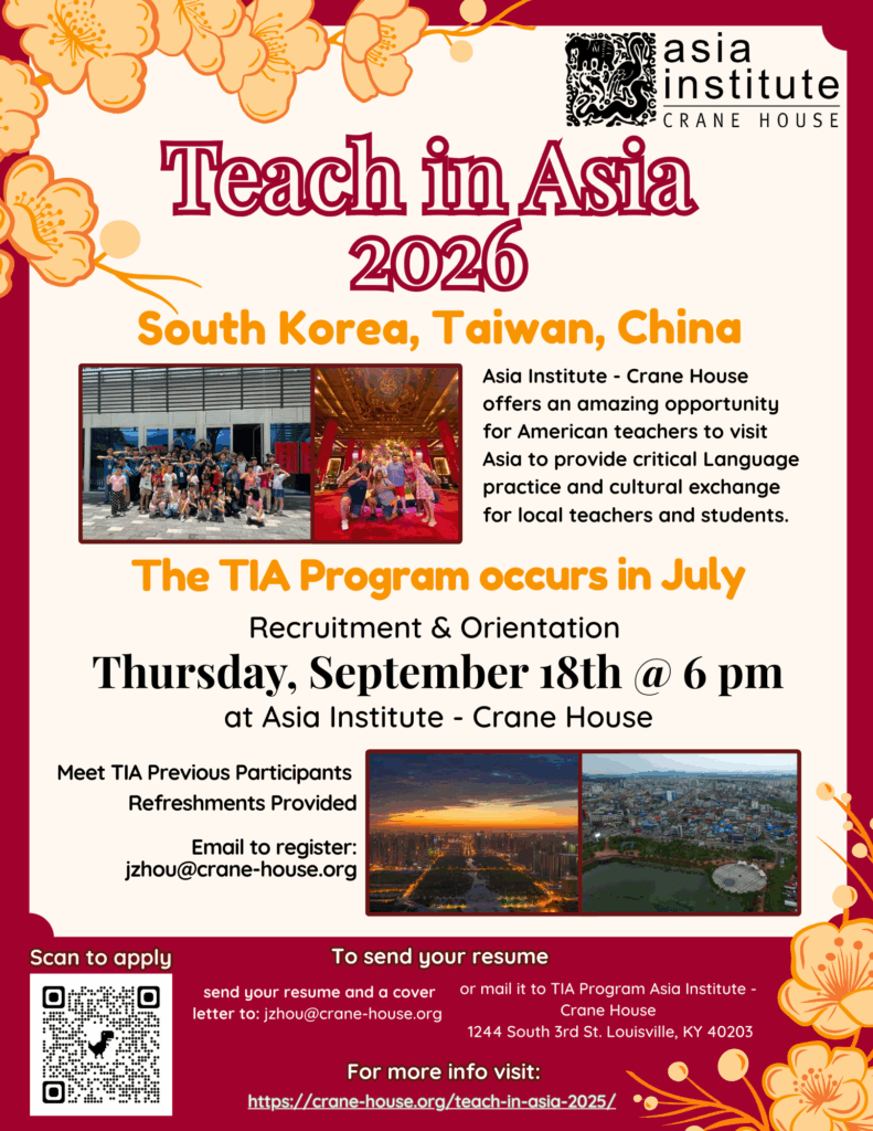 TIA 2026 recruitment and orientation is being held virtually and in person at the Asia Institute – Crane House in Louisville on Sept.1 8 at 6 p.m. ET. Attendees will have the opportunity to meet previous TIA teachers and enjoy the provided refreshments. Email Joanne Zhou to register your spot at his recruitment event!